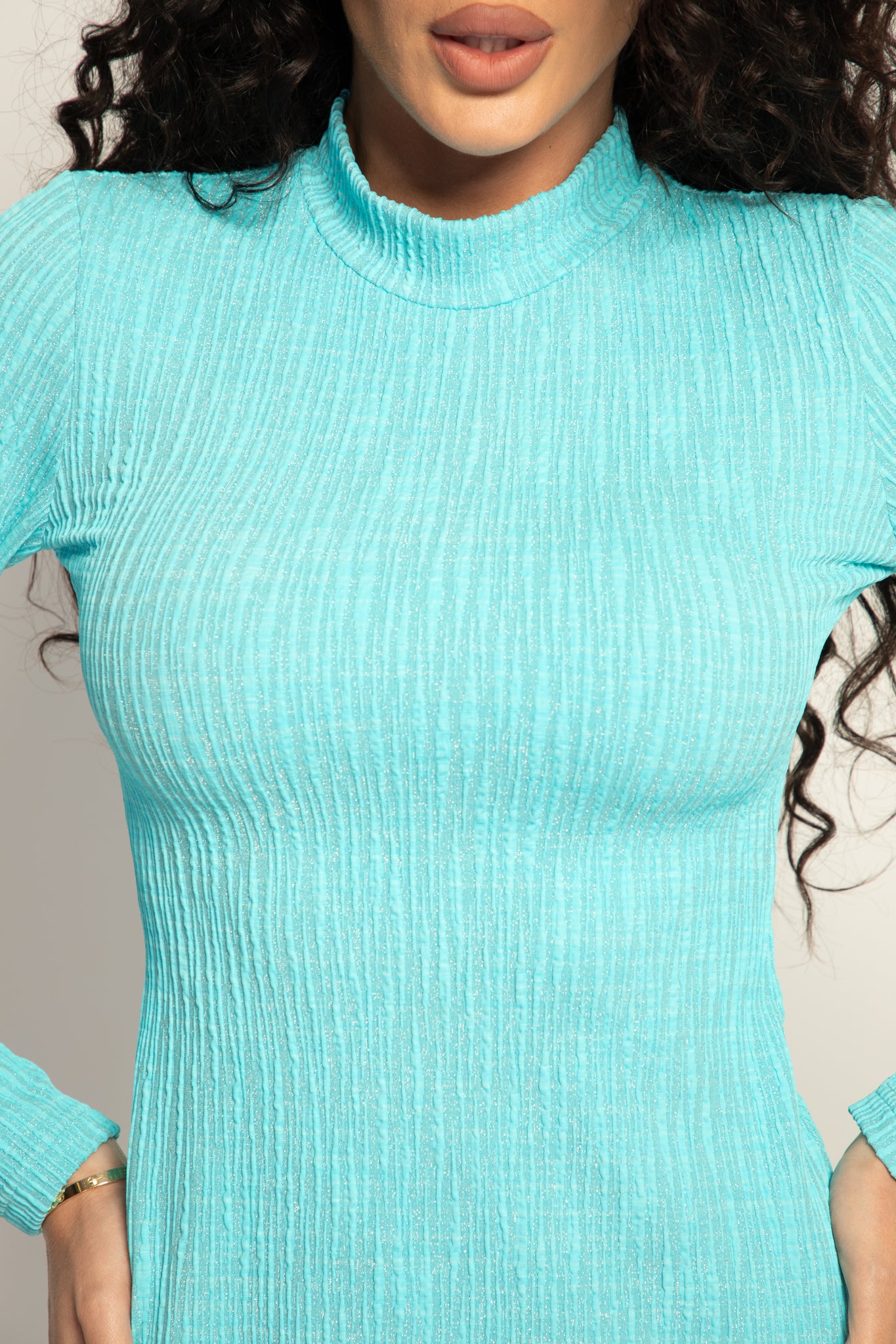 Елегантна поло рокля с дълги ръкави, изработена от ефектна релефна полиестерна материя с висока еластичност, която приляга по тялото. Подходяща за специален повод или парти, отразяваща красиво светлината и подчертаваща всяко ваше движение!